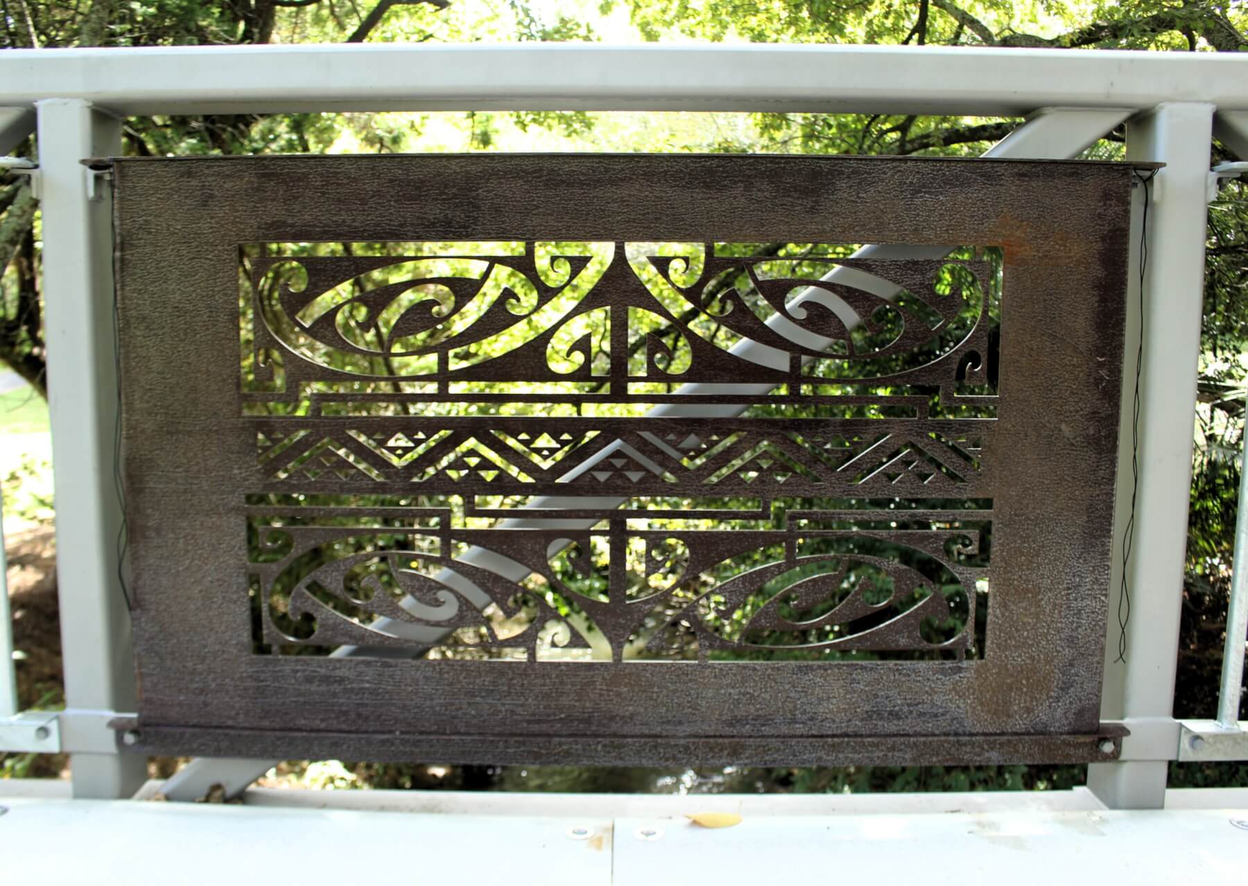 Two panels, designed by Korotangi Paki, were added to the centre of each bridge above the beds of the Mangaohoi and Mangapiko streams.
